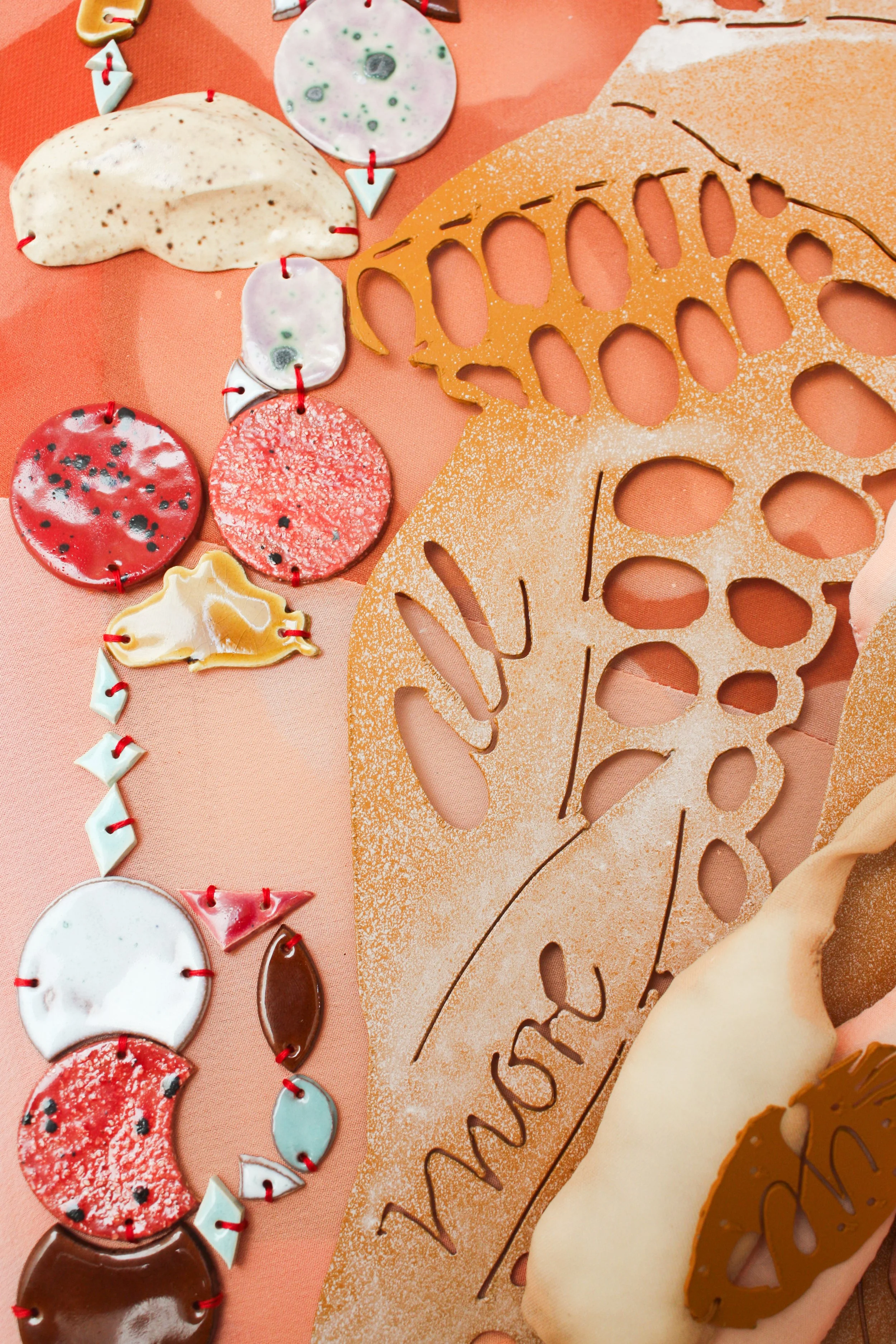 glazed ceramics, chiffon, cotton, thread, wood